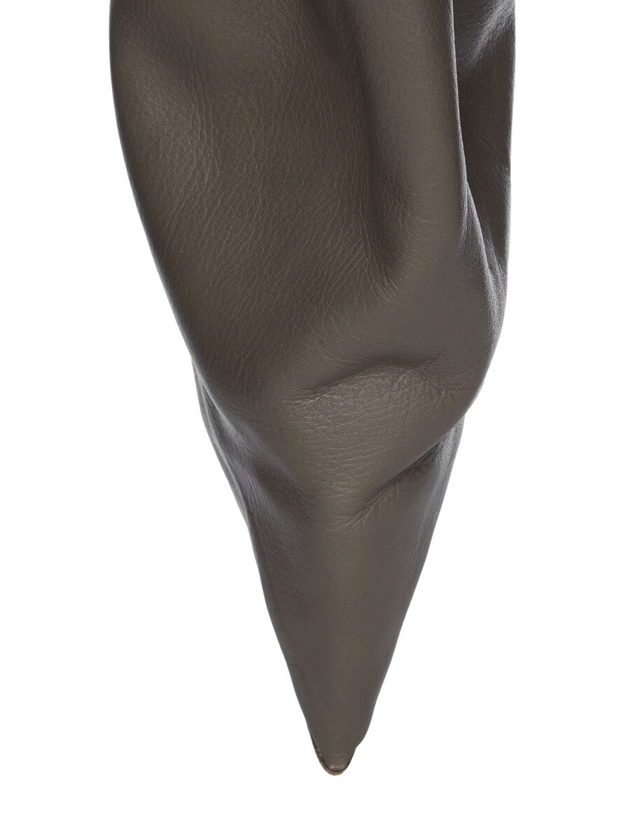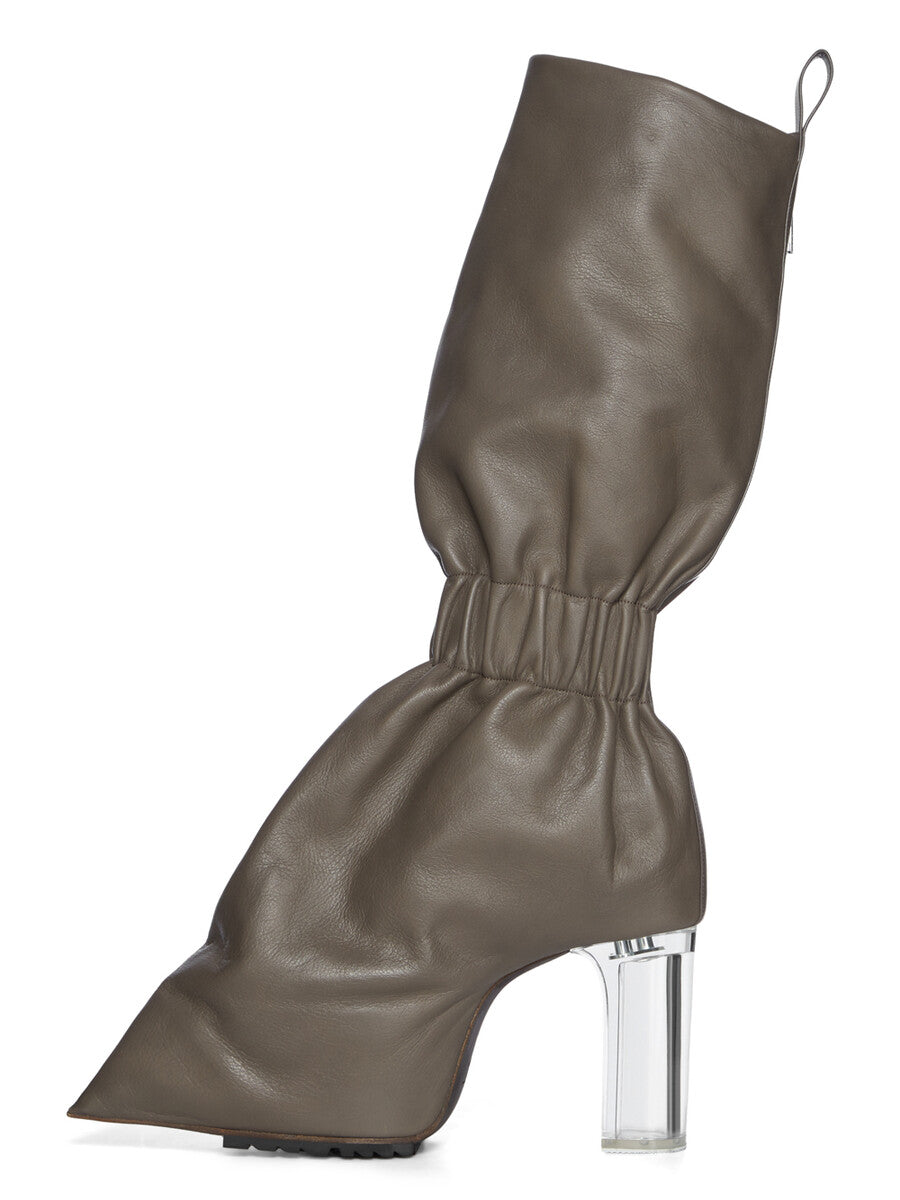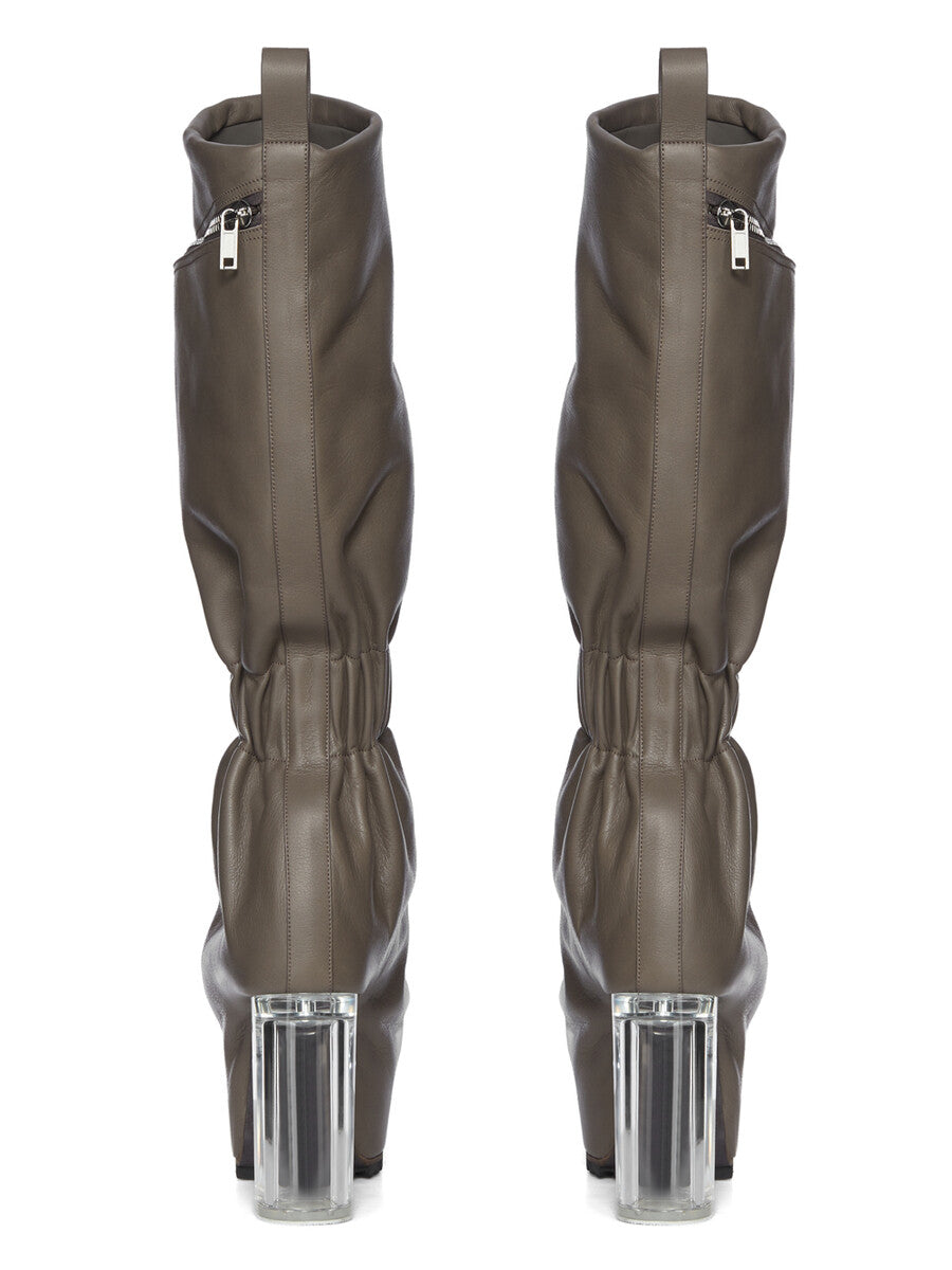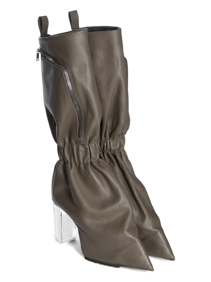THESE CARGO TAQUITO ARE A SHORT, DEFLATED, VERSION OF OUR STRAYTUKAY COLLABORATION BOOTS. THEY ARE ABOVE ANKLE HEIGHT. THEY FEATURE A LEATHER UPPER WITH A CARGO ZIPPERED POCKET ON THE OUTER SIDE, THEY THEN FLARE DOWN FROM THE ANKLE AND IS ELASTICIZED AROUND THE ANKLE, CREATING A SLIGHT DRAPE. IT THEN CURVES INTO THE BACK HEEL AND POINTS AT THE TOE. THEY HAVE A 12CM HEEL, A THICK FRONT PLATFORM (7,5CM) AND A 4,5CM RISE AND A BACK PULL TAB.