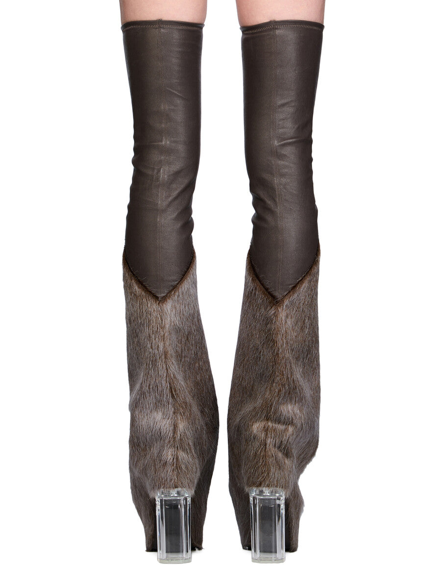 THESE TACO KISS BOOTS ARE A DEFLATED VERSION OF OUR STRAYTUKAY COLLABORATION BOOTS. THEY ARE THIGH HIGH. THEY HAVE A TIGHT SOCK UPPER, JOINING TO A DIAGONAL SEAM LINE THAT SLOPES FROM MIDPOINT, OVER THE KNEE, DOWN TO THE CENTRE BACK CALF. THEY FEATURE A LEATHER UPPER THAT FLARES DOWN THE LOWER LEG, CURVING INTO THE BACK HEEL AND POINTING AT THE TOE. THEY HAVE A 12CM TRANSPARENT HEEL (4,5CM RISE) AND A THICK FRONT PLATFORM.
