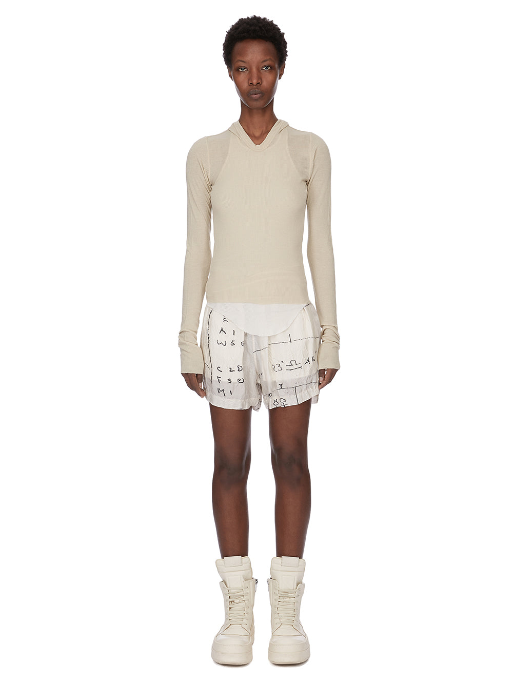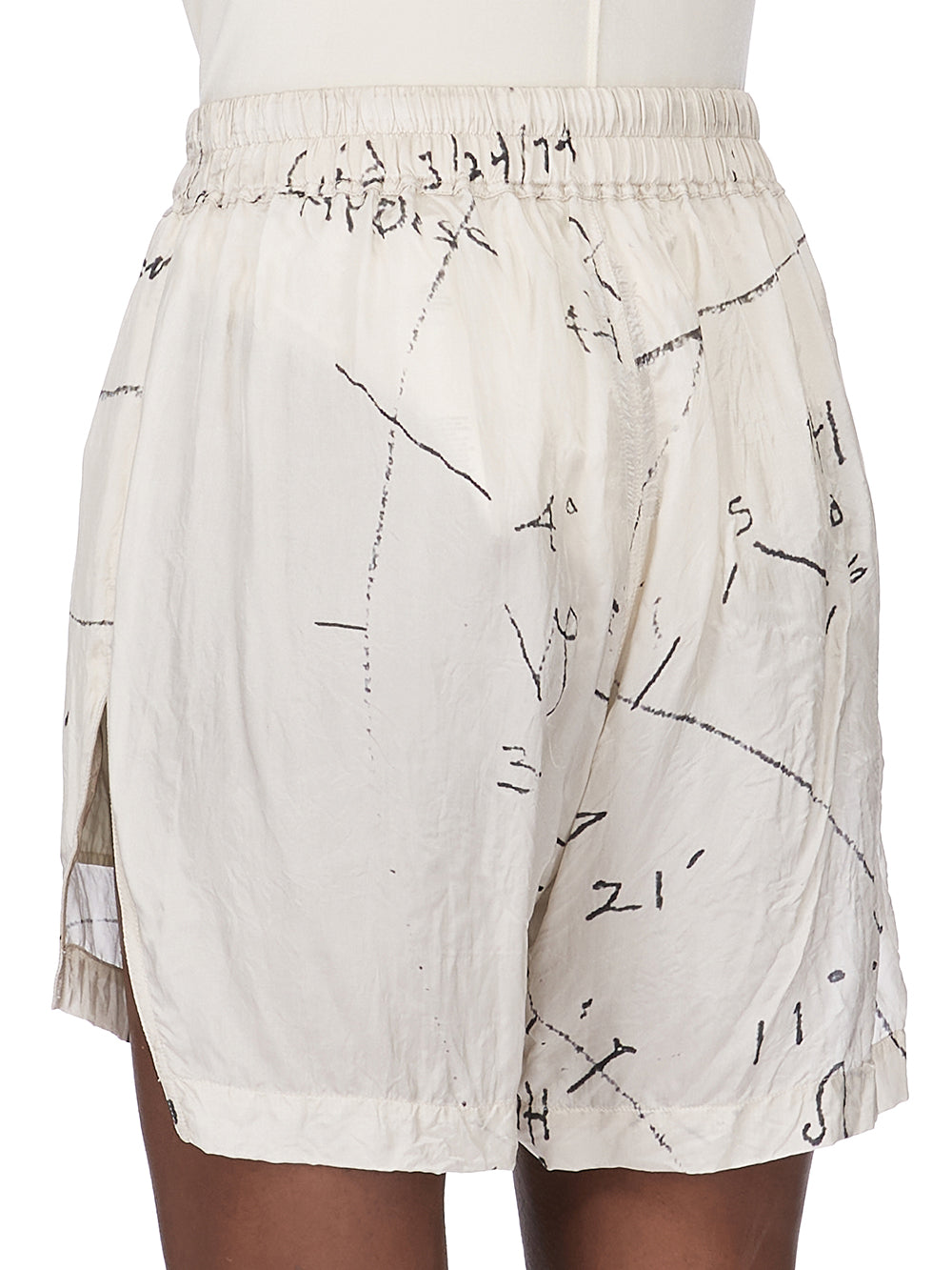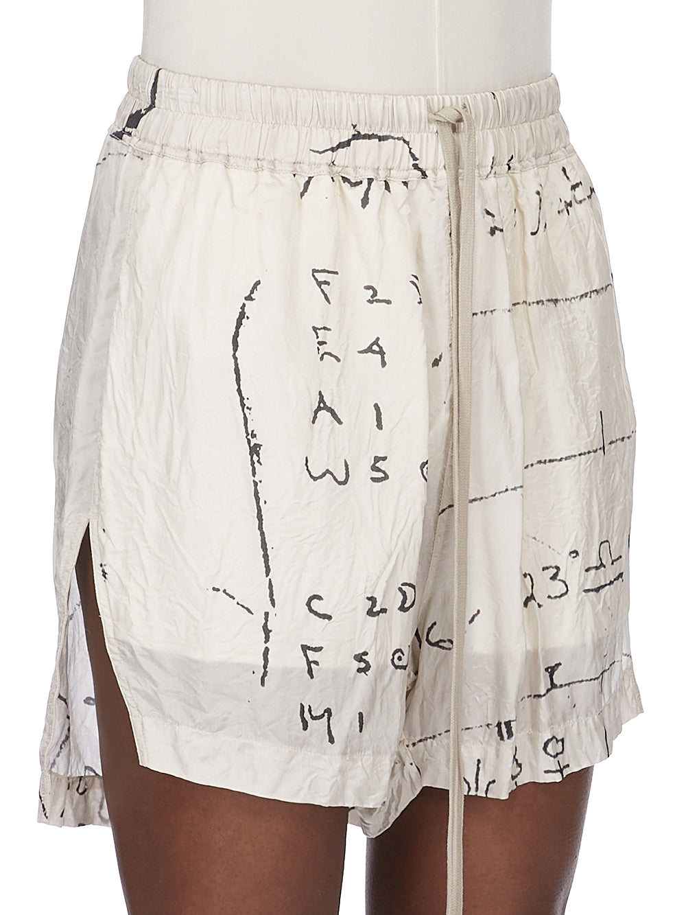 RICK OWENS SS26 TEMPLE BOXERS IN MILK/BLACK PRINTED CUPRO TWILL