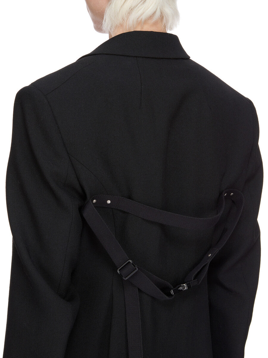 THIS ALICE JACKET IS ABOVE HIP LENGTH WITH LONG SLIM SLEEVES. IT HAS CLASSIC SLOPING SHOULDERS WITH LEVEL SHOULDER SNAPS AND A SLIM LAPEL, WITH A SINGLE BUTTON CLOSURE. IT HAS TWO VERTICAL SIDE FRONT JET POCKETS. IT HAS 5 BUTTON CUFFS, DOUBLE BACK VENTS AND FEATURES AN ADJUSTABLE, THIN COTTON WEBBING DISCO STRAP, WITH CLIP, ACROSS THE BACK YOKE.