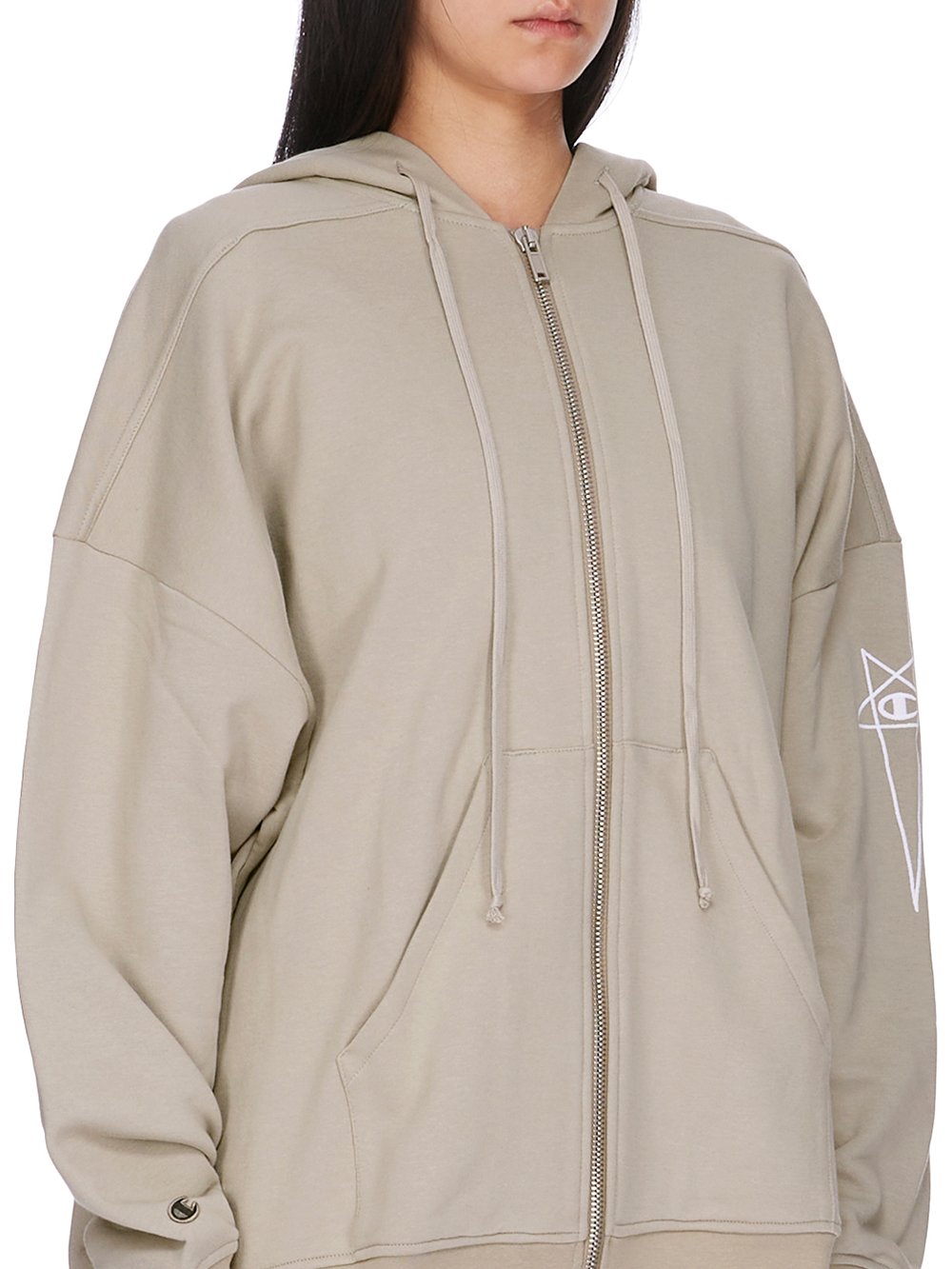 IT FEATURES A 3D EMBROIDERED SIGNATURE CHAMPION X RICK OWENS PENTAGRAM LOGO ON THE LEFT UPPER ARM AND CHAMPION LOGO ON RIGHT WRIST.