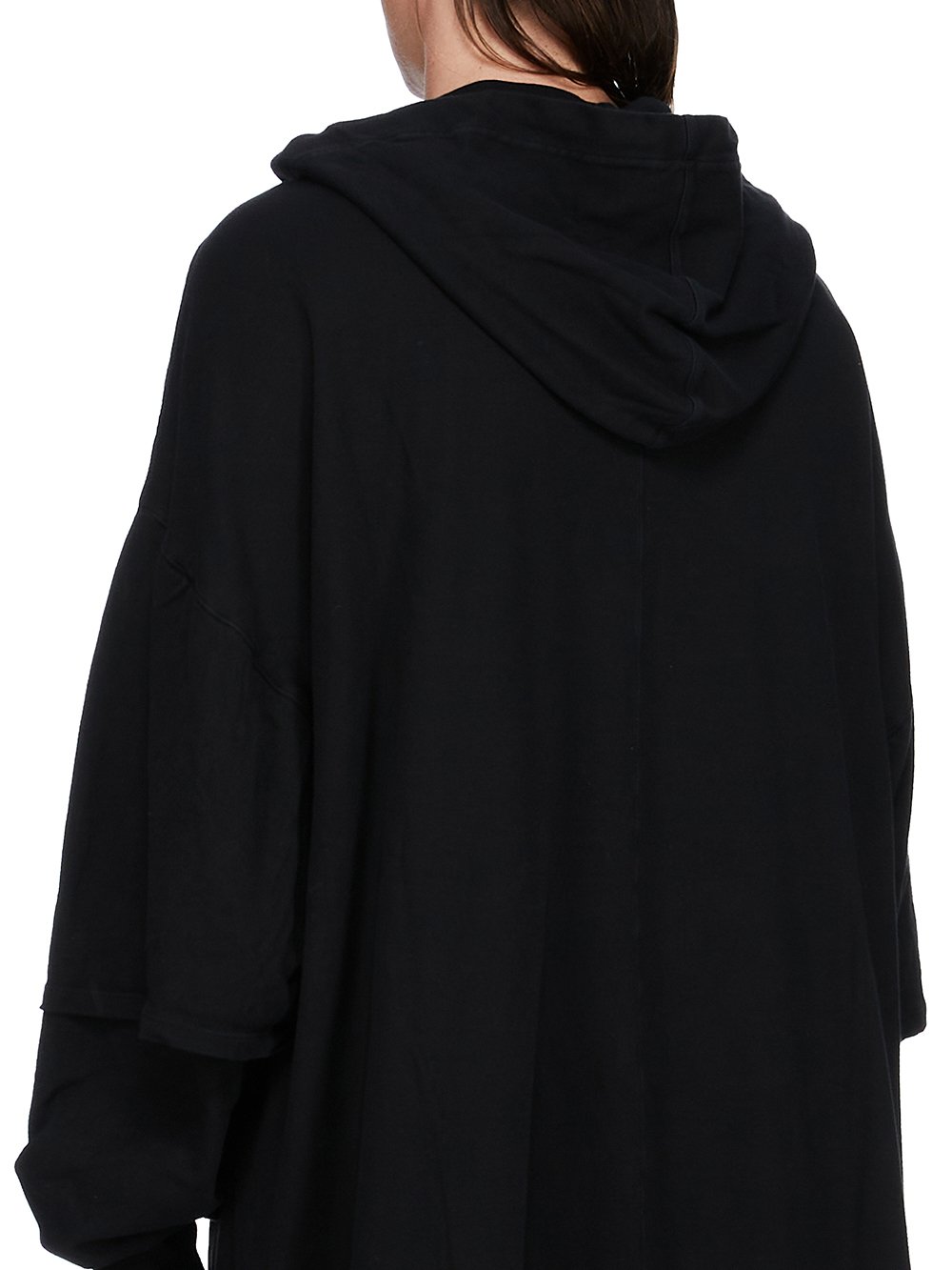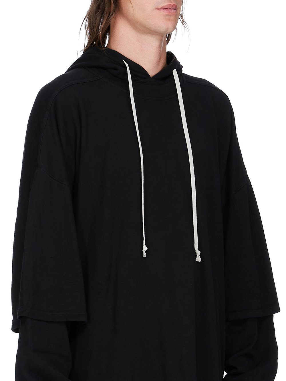 THIS TOMMY HUSTLER HOODIE IS BELOW-HIP LENGTH WITH A JUMBO OVERSIZED FIT. IT FEATURES A LONG SLEEVE T-SHIRT WITH RIBBED CUFFS AND A DRAWSTRING HOOD, OVERLAID WITH A CROPPED OVERSIZE T-SHIRT WITH ELBOW LENGTH SLEEVES. IT HAS THE SIGNATURE LEVEL SHOULDER SEAMS AND SINGLE SEAM RUNNING DOWN THE CENTRE BACK SPINE.