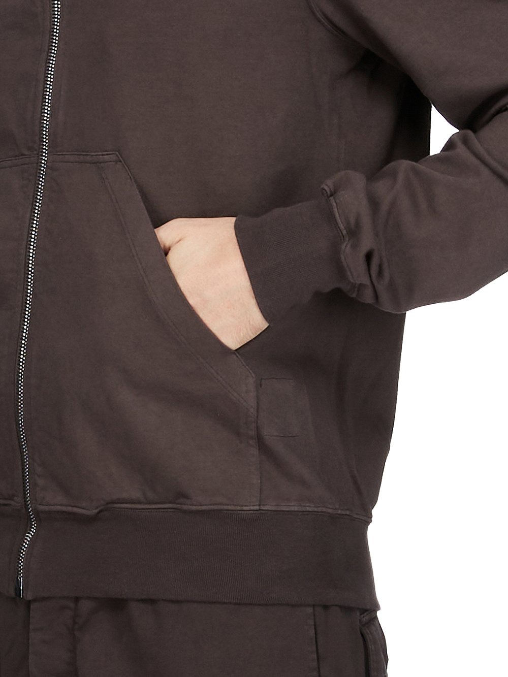 THIS MOUNTAIN HOODIE IS ABOVE HIP LENGTH WITH LONG SLEEVES. IT HAS A CURVED ASYMMETRICAL ZIPPER CLOSURE, A SMALL FUNNEL NECK AND A LARGE POINTED HOOD. IT HAS TWO FRONT PATCH POCKETS, RIBBED CUFFS AND WAISTBAND SIGNATURE SINGLE SEAM RUNNING DOWN THE CENTRE BACK SPINE.
