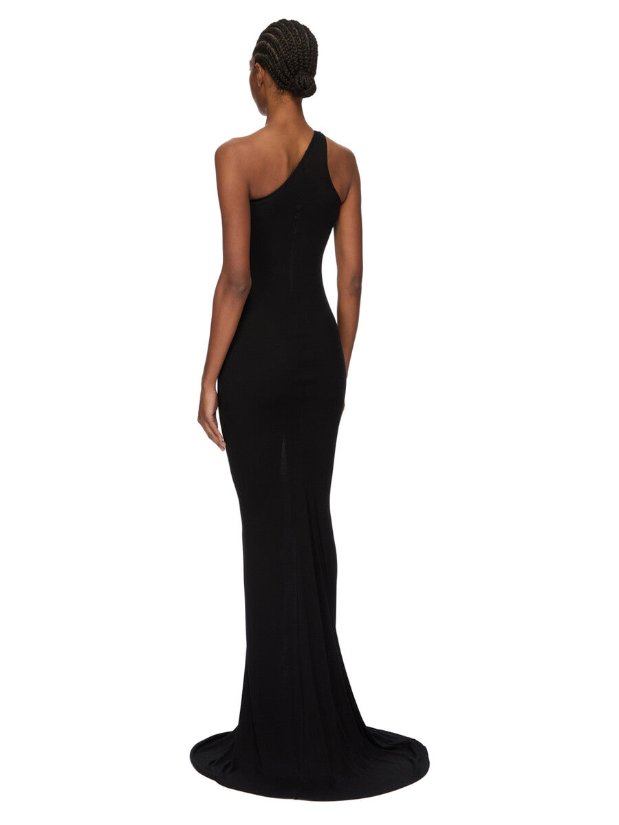 RICK OWENS FW25 CONCORDIANS  ONE SHOULDER GOWN IN BLACK FLUID VISCOSE JERSEY
