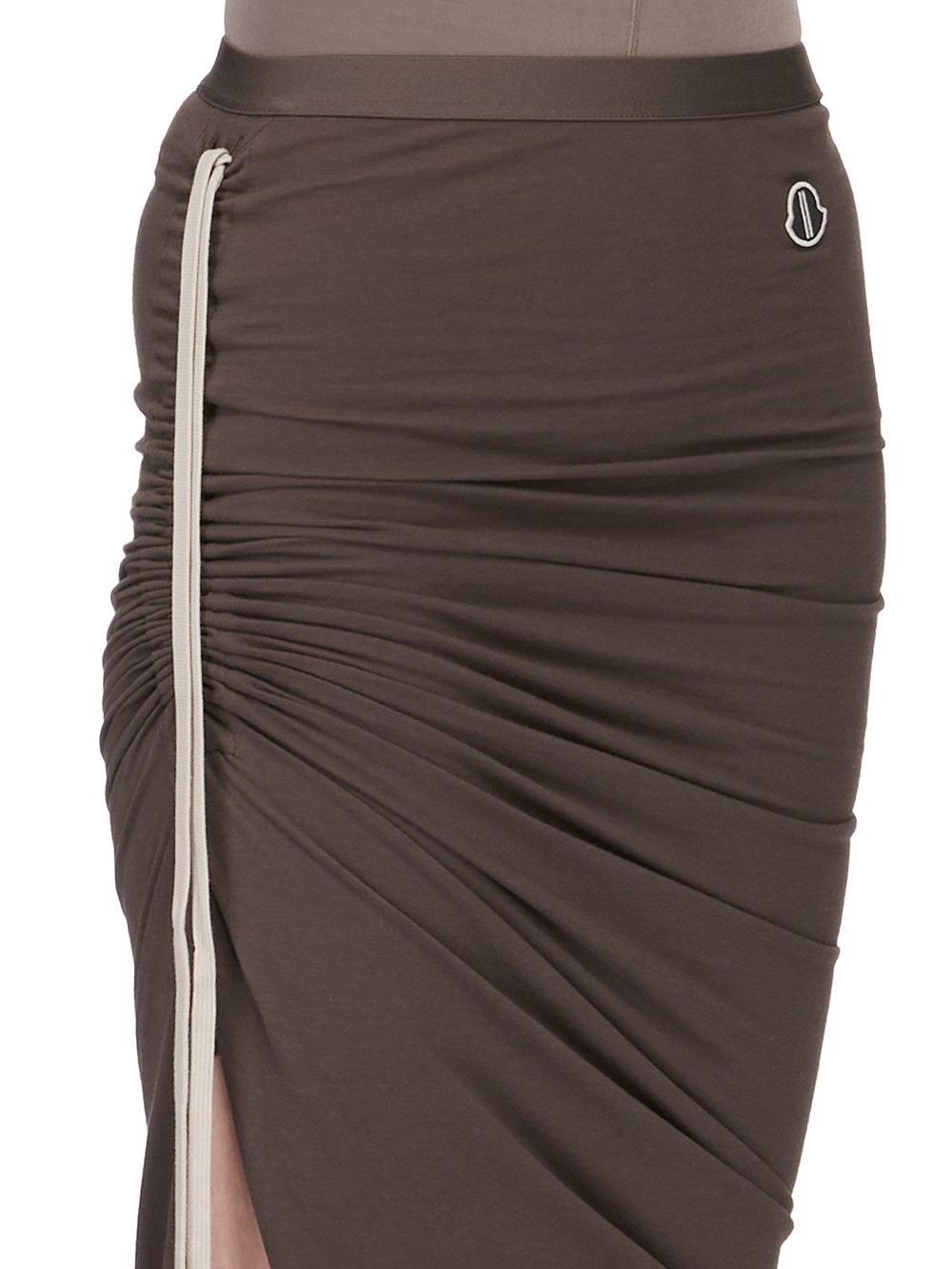 THIS MONCLER + RICK OWENS ADJUSTABLE SKIRT IN MEDIUMWEIGHT COTTON JERSEY TRAILS FLOOR LENGTH AND HAS A SLIT ON THE RIGHT LEG. IT HAS AN ELASTICIZED WAISTBAND AND A SLIM FIT. IT DRAPES AND WRAPS AROUND THE HIPS, AND GATHERS INTO A SEAM ON THE RIGHT THIGH. THE SIDE SPLIT CAN BE MODIFIED USING THE DRAWSTRING. A HIGHER, OR LOWER, SPLIT CREATES INCREASED DRAPING AND RUCHING. ITS TRAIN LAYS FLOOR LENGTH TO THE LEFT. IT HAS THE MONCLER + RICK OWENS EMBROIDERED LOGO PATCH ON THE LEFT HIP.