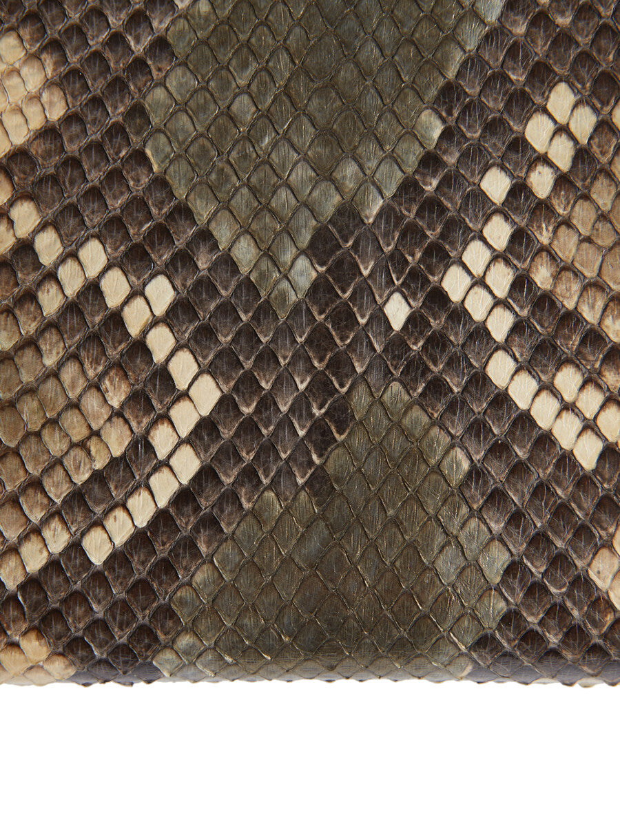 THIS GENUINE PYTHON SNAKESKIN HAS A WAXY AND SOFT HAND FEEL. IT IS COLORED IN A DIAMOND PATTERN FOLLOWING THE NATURAL SCALES OF THE PYTHON. EACH STEP OF THE COLORING PROCESS IS EXECUTED BY HAND.
