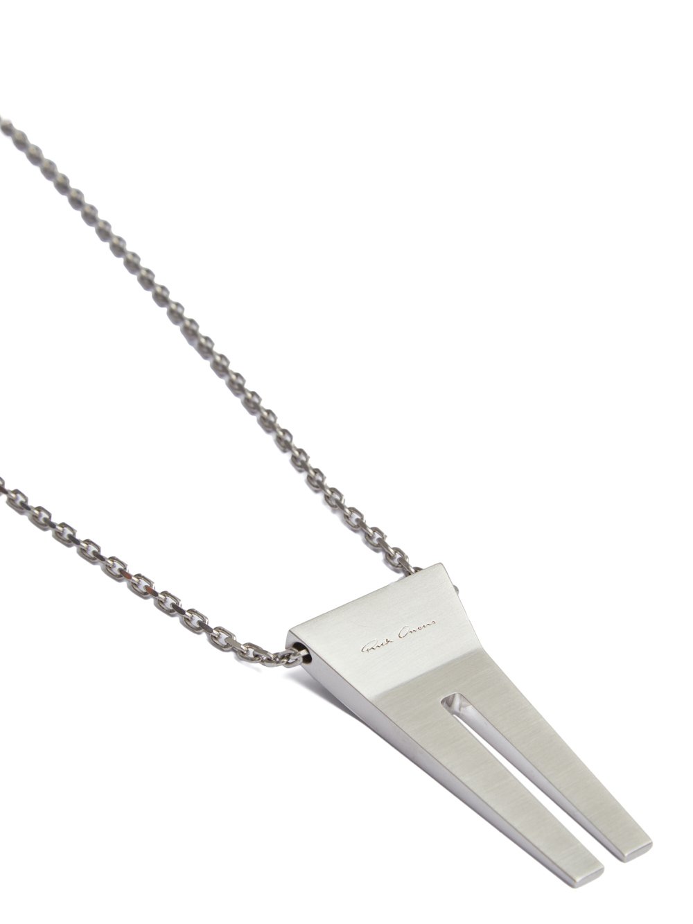 THIS OPEN TRUNK CHARM NECKLACE HAS A SMALL GEOMETRIC TRUNK SHAPE CHARM WITH BEVELED EDGES AND AN OPEN FACE CENTRE SLIT, HANGING FROM A CHAIN NECKLACE. IT HAS THE RICK OWENS LOGO ENGRAVED ON THE BACK.
