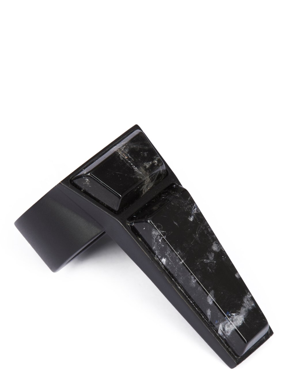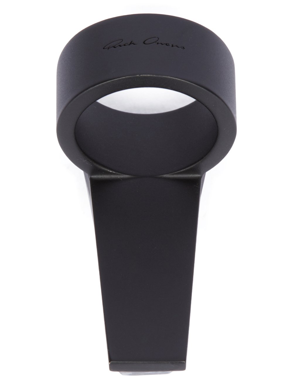 THIS CRYSTAL TRUNK RING IS A THICK BAND WHICH EXTENDS INTO A GEOMETRIC TRUNK SHAPE WITH BEVELED EDGES, ORNAMENTED WITH TWO RECTANGULAR ROCK CRYSTALS AND THE RICK OWENS LOGO ENGRAVED ON THE BACK.