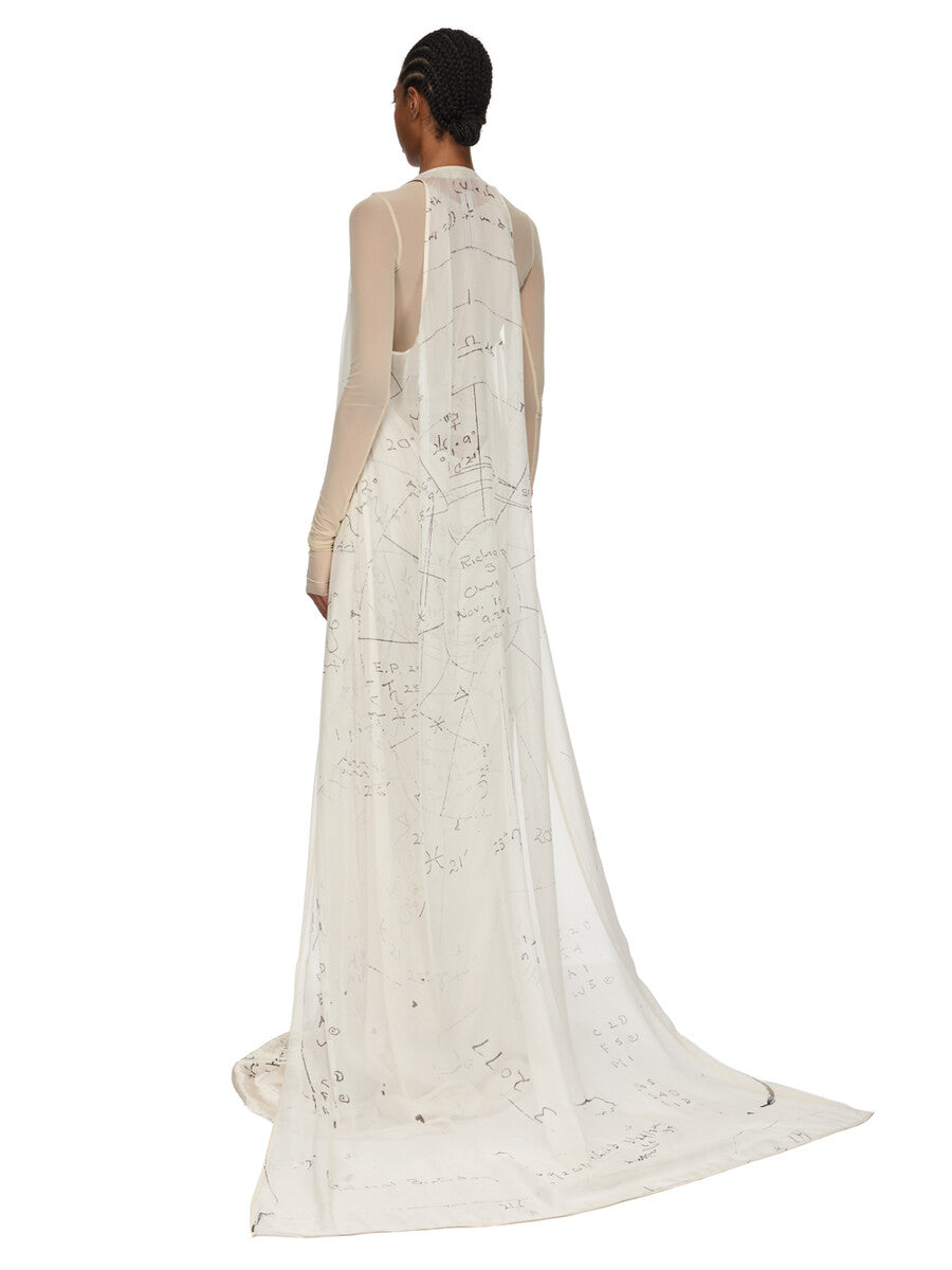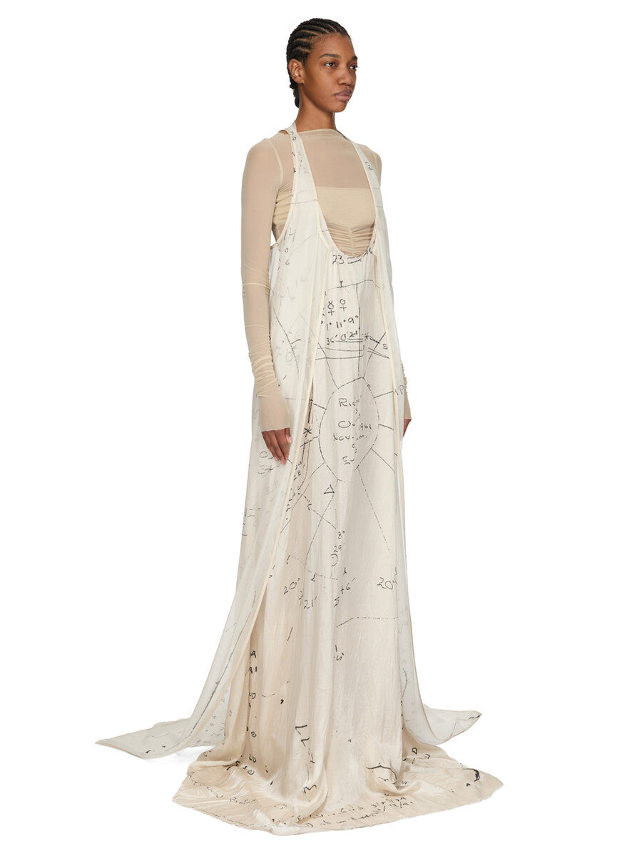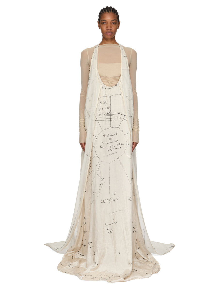 RICK OWENS SS26 TEMPLE SLICED PONY TANK LONG IN MILK/BLACK PRINTED SILK CHIFFON