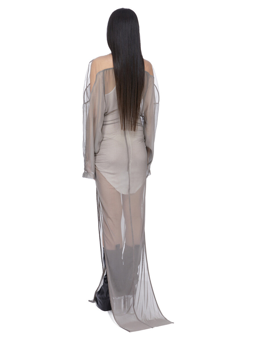 RICK OWENS SS26 TEMPLE COLLAGE GOWN IN DUST STRETCH TULLE, SILK CHIFFON AND TULLE