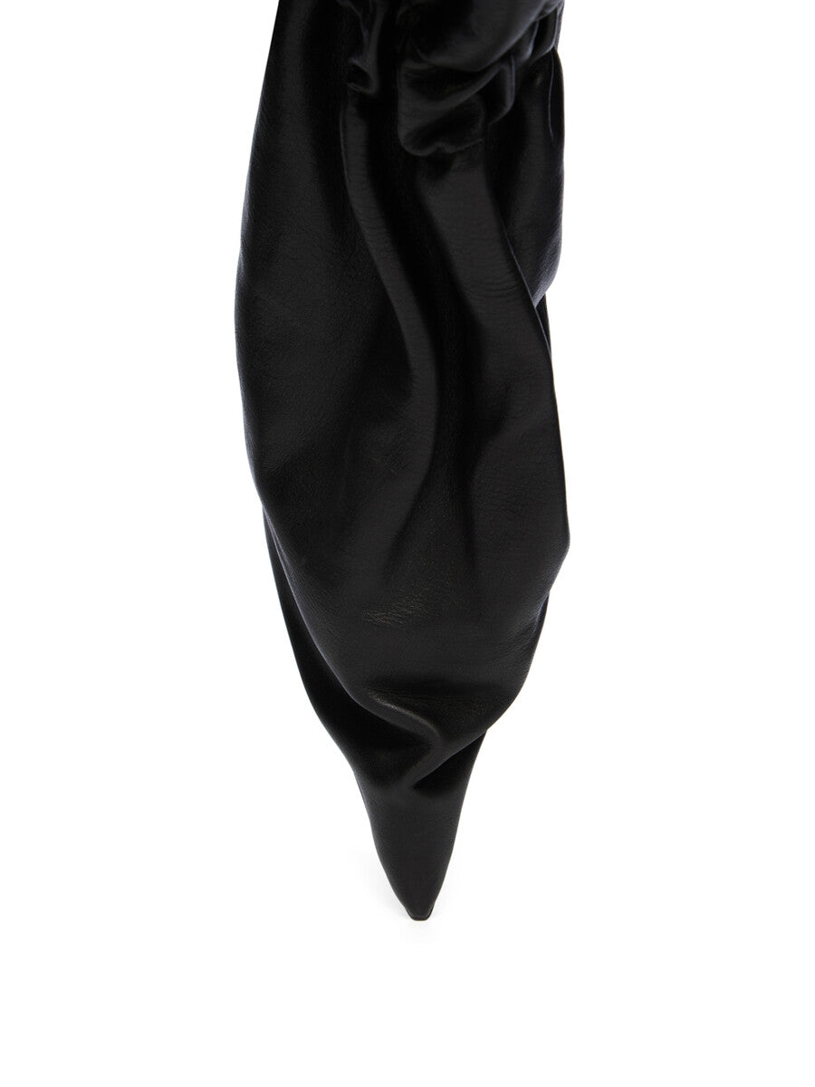 THESE TIED TAQUITO ARE A SHORTER, DEFLATED, VERSION OF OUR STRAYTUKAY COLLABORATION BOOTS. THEY ARE ABOVE ANKLE HEIGHT. THEY FEATURE A LEATHER UPPER THAT FLARES DOWN FROM ABOVE ANKLE AND IS ELASTICIZED AROUND THE ANKLE, CREATING A SLIGHT DRAPE. IT THEN CURVES INTO THE BACK HEEL AND POINTS AT THE TOE. THEY HAVE A 12CM HEEL, A THICK FRONT PLATFORM (7,5CM) AND A 4,5CM RISE AND A BACK PULL TAB.