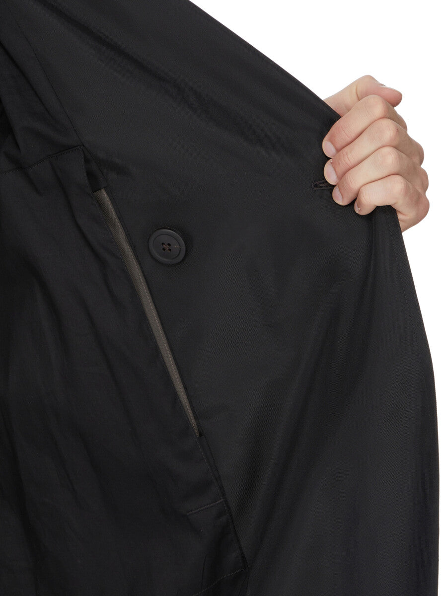 THIS TEMPLE TRENCH IS BELOW KNEE LENGTH WITH LONG SLEEVES. IT HAS A DOUBLE BREASTED FRONT WITH VISIBLE BUTTON CLOSURE AND BELT WITH HORN BUCKLE. IT FEATURES A WIDE LAPEL AND ISLAND STRAP COLLAR, A VERTICAL FOG FRONT POCKET WITH SNAP CLOSURE, AND TWO SIDE SEAM POCKETS. IT HAS 2 BUTTON CUFFS, A CENTRE BACK VENT AND ROUNDED, STRUCTURED SHOULDERS. IT IS FULLY LINED WITH TWO INTERNAL ZIPPERED POCKETS.