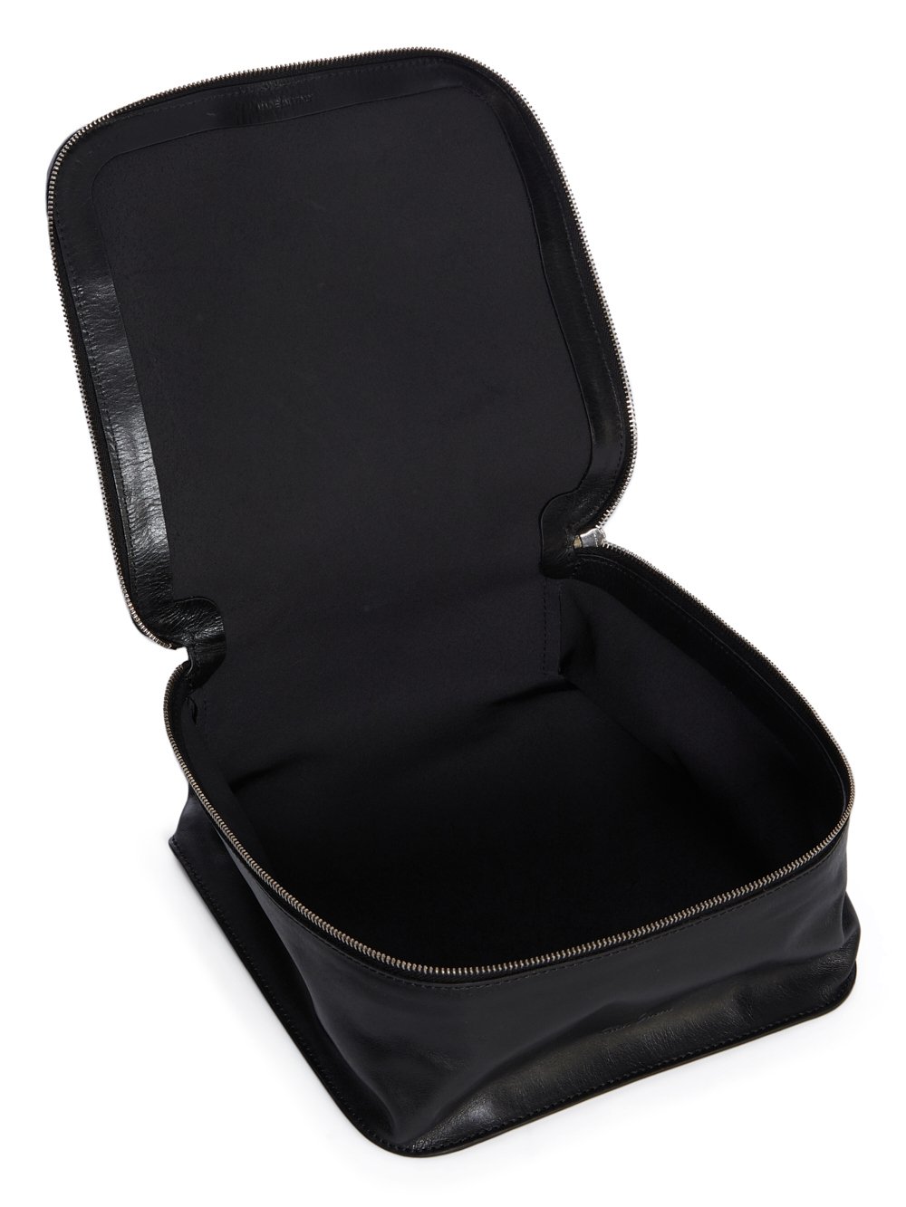 THIS RICK OWENS LARGE BEAUTY CASE IS A DEEP, SQUARE LEATHER CASE WITH A ZIPPER AROUND THREE OF THE TOP EDGES. IT HAS A LEATHER CARRYING STRAP ATTACHED TO THE BACKSIDE AND A ZIPPER ENGRAVED WITH THE RICK OWENS LOGO.